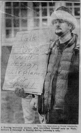 So I’m officially on strike today. Viva la Huelga! Up the establishment! Power to the people and all that crap. I’m going to spend a lot of money to send a message to the capitalist pigs that I work for, that worker’s have nothing to lose but their chains, yadda, yadda, yadda... Of course, I’ve been out once before. For one whole day. I don’t even belong to the union, but if enough of the people that suffer under the same contract as I do feel like they’re not getting a square deal, then I’m probably not either, and I’ll walk with them. Seven years ago we had a rally at the Museum of Flight, and I carried this sign. It says “Will design airplanes for food”. Something like that is just too precious to throw away, and I didn’t. Back then, I got my picture in the local paper holding that sign in the rain and cold. My mother said that I looked like a Nazi. She apparently can’t tell the difference between a Nazi and a Bolshevik, which is what we ultimately decided that she meant. Imagine, crossing the entire width of the political spectrum with one slip of un-knowledge. It was the hat and the beard that did it of course, with no thought at all to the message of the sign. So by now, every one in the country has seen the homeless, or at least the beggars, standing on the street corner, or at the freeway off ramp with their signs. “Homeless, hungry. Will work for food. God Bless.” On and on, whatever they think is the proper message to get the most quarters out of the people who drive by in their cars, feeling guilty for having a job, having a home, having a life. I’m never tempted to give those people anything, the primary reason is that begging is their job. They stand on that corner for any number of hours a day, holding their sign, and maybe a coffee cup. They work at it. It’s their job. There are perks of course. I mean, they work outside, and they’re their own boss. They choose their own hours. My buddy Sky tells me that there are these two people who share a particular street corner in his neighborhood, taking turns holding the sign and the cup. They’ve worked out a job sharing arrangement. It’s their job. So today, i walked off the job, and I grabbed my sign that’s been hanging on my desk for a couple of weeks now. We circled the upper floors a few times, hoping to generate some enthusiasm, but the people we saw weren’t walking. It got tiresome quickly, so we left, heading towards the local high school stadium for a rally. Did they have Spirit Week rally’s for your high school football team when you went to school? This was just like that. Lots of repetitious chanting and booing and hissing at the appropriate targets at the appropriate times. “Who are we?” “SPEEA!” “Who are we?” “SPEEA!” “Who are we?” “SPEEA!” “Who are we?” “SPEEA!” How original. Or “We are Boeing!” “We are Boeing!” “We are Boeing!” Enlightening. In any case, I didn’t actually go into and participate in the rally. I stood on the corner of the parking lot entrance, greeting the hundreds of people that were heading to the rally with my stupid little sign. I could always tell the people who are inured to looking at the homeless and their signs, because they noticed me there, and turned their heads and looked away. Those people weren’t any fun. But there were the ones who looked at me, read the sign, thought about it for a second, then burst out laughing. That made it all worthwhile. I mean, what I saw was a few thousand people who had the weight of the world on their shoulders. They were thinking about their jobs, their mortgages, how to feed the kids, their alimony payment, whatever. Then, for one brief shining moment, they saw my sign, and it made them laugh. A couple of thousand people saw my sign, and it brought a bit of levity into their lives. That made it all worthwhile… And it paid too. I scored two McDonald’s apple pies, a few potato chips, and a couple of bucks in change in the coffee cup that I added to the mix. Of course, the cup made people think of the real homeless, and there were more people who turned their heads away, but the coins that I collected gave me a noise maker, and something to shake. It wasn’t anywhere near the hourly wage that I’m used to, but it was fun. Except for the peso that got dropped into the cup. And the news media liked the message too. A camera guy for one of the local television stations filmed me standing there. I was on the noon news! And the local news radio station asked me to read my sign and explain what it meant. Obviously, a sign doesn’t pull much weight on the radio. After that, some people passed me and told me that they had heard me on the radio! That was fun too. So here’s my little bit of dada theater. For what it’s worth, I hope that somebody who is breaking the strike will see me and my pathetic little sign, and think about why somebody like me might go out and give up what might be several weeks pay, just to send a message to the company that 4% is much better than 3%. And I hope that in the trying days to come, that some of those people who saw my sign will think back, and smile again, and stay out until the company and the union can agree on terms of what my labor is worth. Until then, I’m a very bored strikebreaker, sitting around the house, and making beer. Dark, almost black, and hoppy as all hell. Bleak and bitter beer maker, that’s me… |